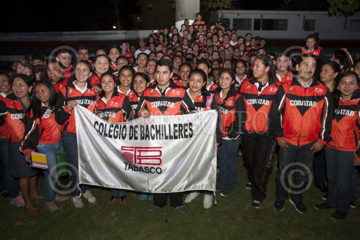 VILLAHERMOSA, TABASCO, 11NOVIEMBRE2014.- Alrededor de 300 jóvenes del Colegio de Bachilleres de Tabasco representaran a este sistema educativo en el Encuentro Sur-Sureste en Huatulco, Oaxaca. Dicho programa de conocimiento, deportivo y cultura en donde participan por primera ves después de diez años, se comprometieron a obtener buenos resultados con el director general del COBATAB, Jaime Mier y Teran, quien dio el abanderamiento de salida al contingente con los educando mejor preparados en cada una de las disciplinas. FOTO: MARCO POLO GÚZMAN /CUARTOSCURO.COM