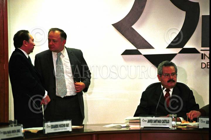 México, D.F. 19 AGOSTO 2004.- Javier Santiago Castillo, consejero presidente, Adolfo Riva Palacio Neri, secretario ejecutivo del IEDF y Eduardo Huchim May, consejero electoral y presidente de la comisión de Fiscalización durante la sesión extraordinaria donde se trato el presuntó rebase de tope de gastos de campaña en que incurrió el PAN en 2000. FOTO: Sandra Perdomo/CUARTOSCURO.COM