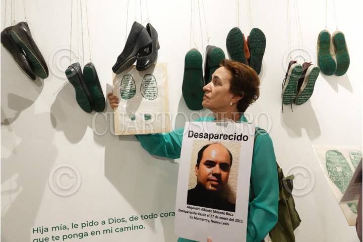 CIUDAD DE MÉXICO, 08MAYO2025.- Madre de Alejandro Alfonso Moreno Baca, víctima de desaparición forzada, mostró el par de zapatos con los que ha caminado para buscarlo durante la inauguración de la exposición "Huellas de la memoria" en el Palacio de Minería, que contiene más de 280 pares de zapatos de familiares que buscan a sus seres queridos en los estados de la República. La muestra estará abierta al público del 8 de mayo al 3 de agosto. FOTO: GRACIELA LÓPEZ/CUARTOSCURO.COM