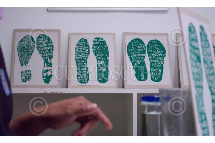 CIUDAD DE MÉXICO, 28JUNIO2017.- Ana Enamorado, madre de un migrante hondureño desaparecido en México, colaboró con Alfredo López Casanova, escultor, que llevará a Berlin la exposición "Huellas de la memoria" que reúne los zapatos desgastados por el andar de personas que buscan a sus familiares así como suelas impresas con promesas hacía los desaparecidos. La exposición estará del 4 al 7 de Julio en la sede de la fundación Heinrich Böll Stiftung en Alemania. FOTO: SELENE PACHECO /CUARTOSCURO.COM