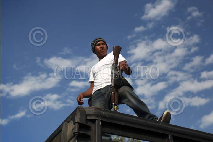 LAS HUERTAS, MICHOACÁN, 17ENERO2014.- Un contingente de miembros de los grupos de autodefensa de Michoacán se apoderaron de la localidad de Las Huertas en donde instalaron barricadas y detuvieron a hombres armados pertenecientes presuntamente al cartel de Los Caballeros Templarios. La comunidad se encuentra a tres kilómetros de Apatzingán, ciudad que mantienen blindada las fuerzas federales. FOTO: FÉLIX MÁRQUEZ /CUARTOSCURO.COM