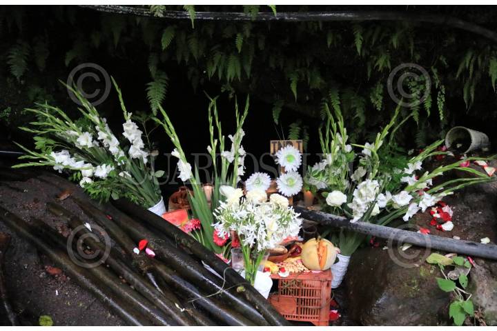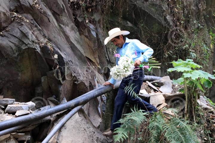 HUEYAPAN, MORELOS, 05MAYO2019.- El agua es el elemento vital, por ello se han desarrollado mitos en torno a ella. En Hueyapan, municipio indígena de reciente creación, pobladores se internan para llegar hasta el manantial Xantamalco, que aflora de las cavidades de una pared de piedra en la ribera del río Amatzinac, y que se alimenta del deshielo del Popocatépetl. Ahí llevan ofrendas de flores, dulces, galletas, velas, licor de agave y cigarros a “Los Aires”, duendes que viven en la profunda barranca. Desde los años 70, las personas han colocado líneas de manguera negra para conducir el líquido desde el manantial hasta sus casas, a través de la fuerza de gravedad. Con las ofrendas y rezos se busca que “Los Aires” garanticen el abasto durante el año. FOTO: MARGARITO PÉREZ RETANA /CUARTOSCURO.COM