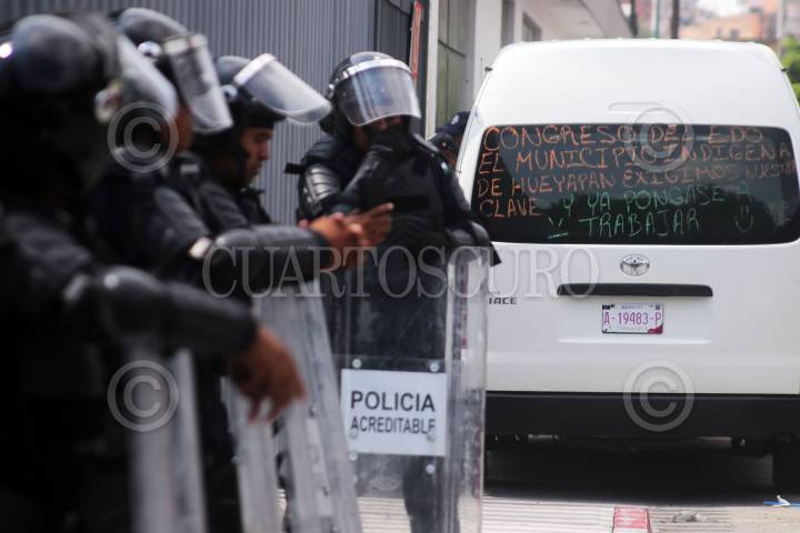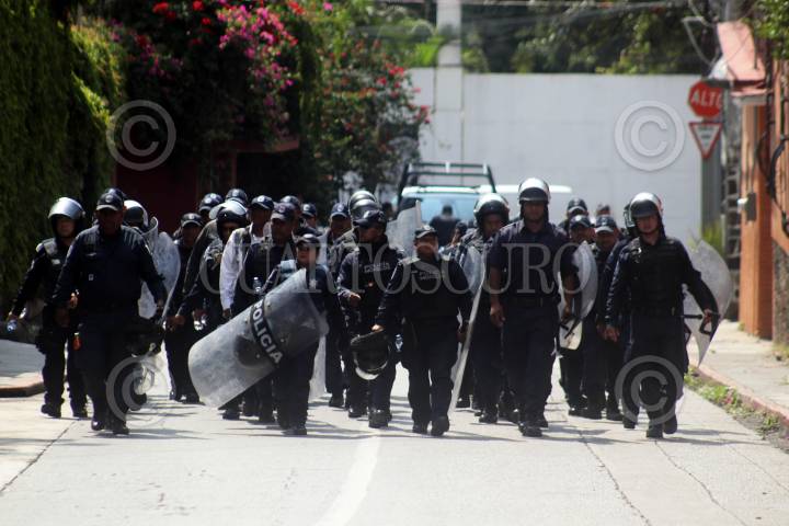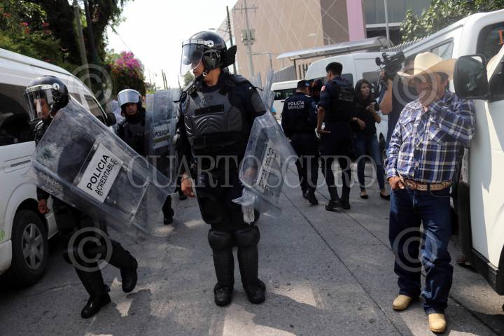 CUERNAVACA, MORELOS, 24OCTUBRE2019.- Policías de Morelos con equipo antimotines llegan a la sede del Congreso local como medida de disuasión. Habitantes del municipio indígena de Hueyapan mantienen tomado el edificio a fin de que el alcalde de Tetela del Volcán firme el convenio de delimitación territorial y les sea entregada la clave de creación, ya que sin el código geoestadístico no puede ser reconocido por el gobierno federal para que le sean asignados recursos. FOTO: MARGARITO PÉREZ RETANA /CUARTOSCURO.COM