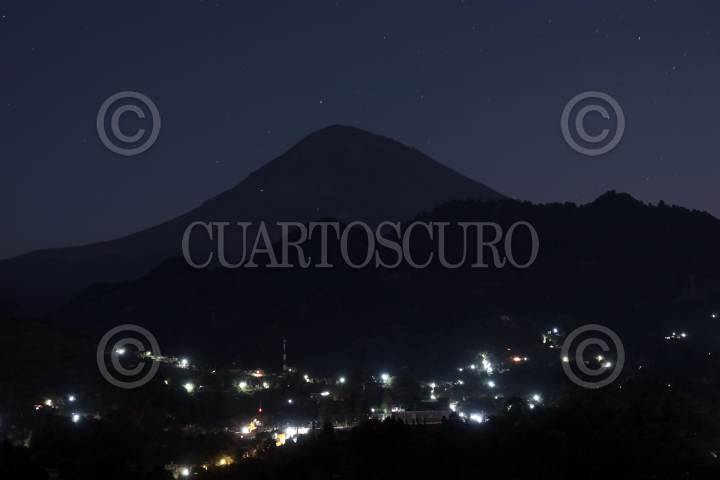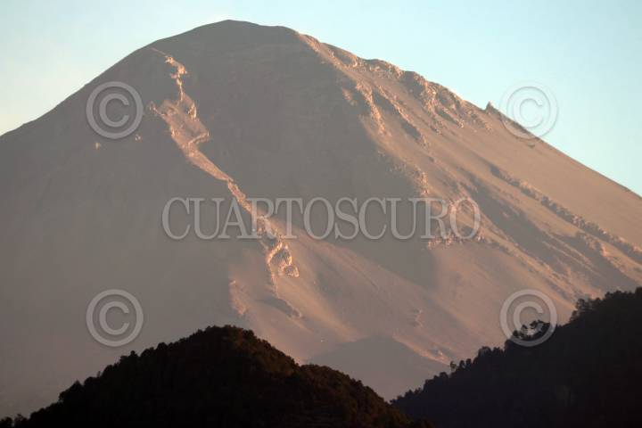 En las ultimas 24 horas el volcan Popocatepetl ha tenido muy baja actividad. Imagen del volcan al amanecer desde el municipio indigena de Hueyapan.