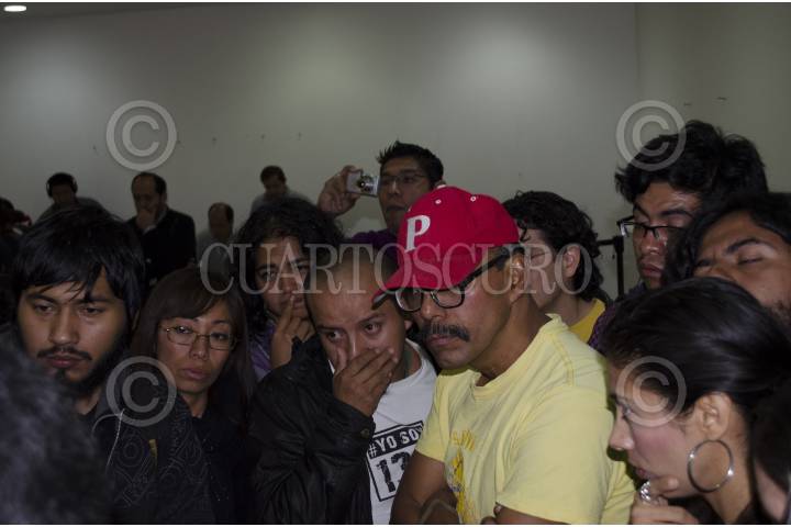 MÉXICO, D.F., 05OCTUBRE2012.- Integrantes del Consejo Estudiantil de Lucha dialogan durante un receso de la mesa de diálogo que se establecio para destrabar el conflicto estudiantil que vive la Universidad Autónoma de la Ciudad de México. En esta mesa también participan obervadores y autoridades de la UACM, encabezados por Jesús Fandiño, secretario general de esta universidad. A casi dos meses de huelga este conflicto no se ha resuelto y fue ocasioado por el rechazo a la integración del Tecer Consejo Universitario, en donde los huelgistas impugnan la elección de 8 consejeros afines a la rectora María Esther Orozco, quien por cierto no acudió a la cita en Casa Lamm. FOTO: SANDRA PÉREZ /CUARTOSCURO.COM