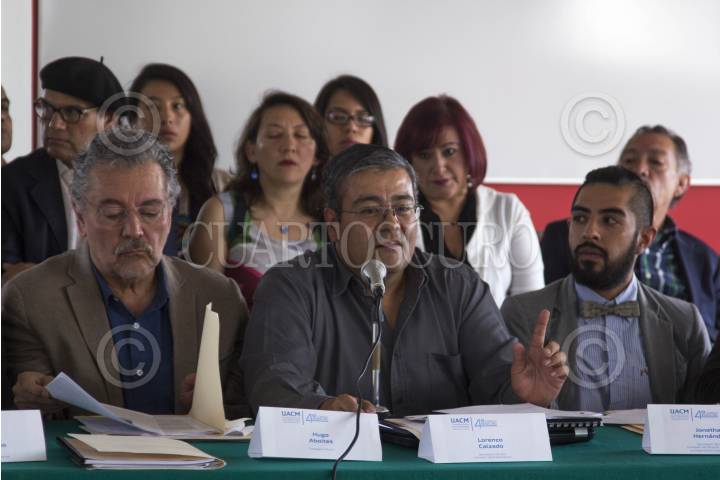 MÉXICO, D.F., 09MARZO2015.- Hugo Aboites, Consejero Rector de la UACM junto a Lorenzo Calzado, Secretario Técnico de Organización de la UACM durante la conferencia donde dieron a conocer que se pretende reducir el presupuesto para la institución lo cual afectaría en su crecimiento y mantenimiento ya que no se acabarían de construir aulas destinadas para estudiantes. FOTO: ENRIQUE ORDÓÑEZ /CUARTOSCURO.COM