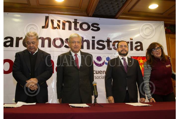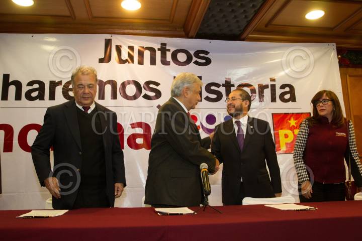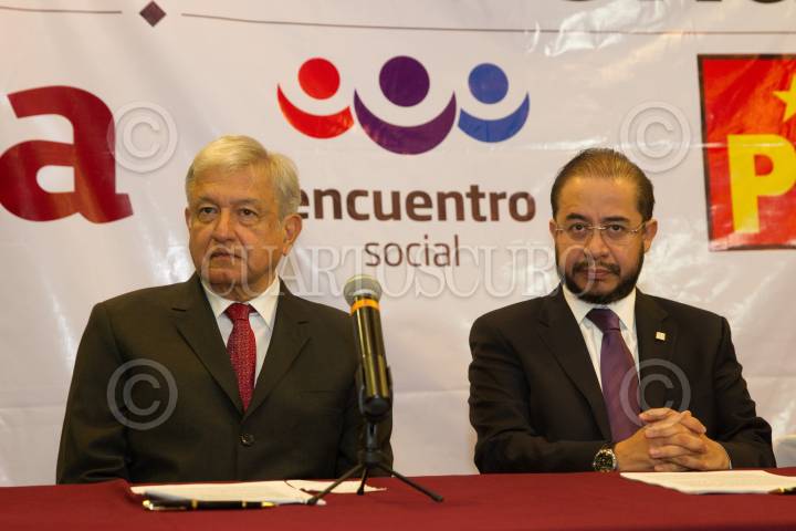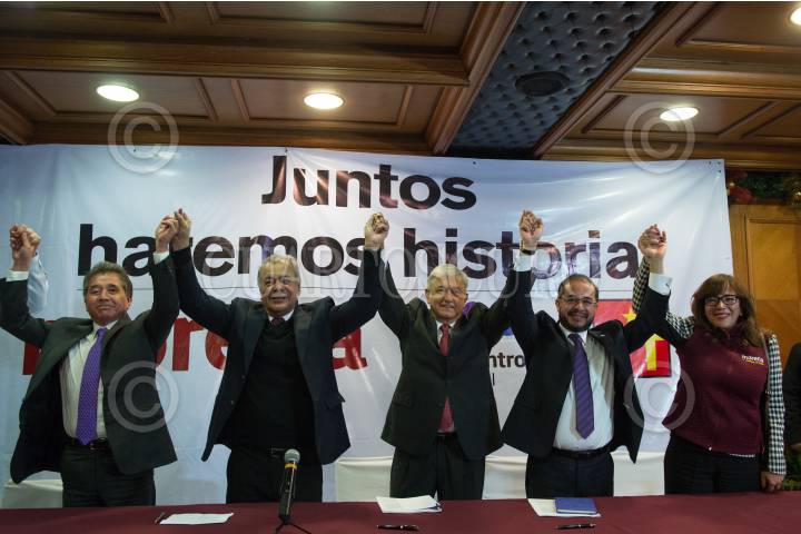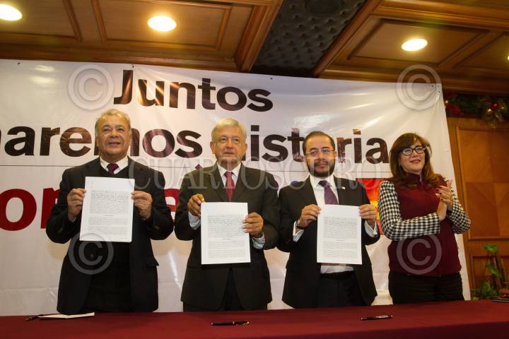 CIUDAD DE MÉXICO, 13DICIEMBRE2017.- Andrés Manuel López Obraor precandidato a la Presidencia por Morena firmó una alianza electoral con el Partido del Trabajo y el Partido Encuentro Social, lo acompañaron los dirigentes Alberto Anaya (PT) y Hugo Eric Flores (PES). FOTO: CUARTOSCURO.COM