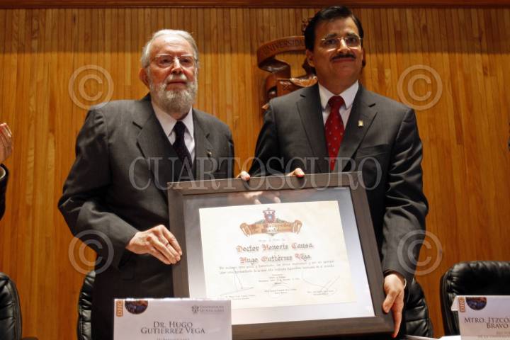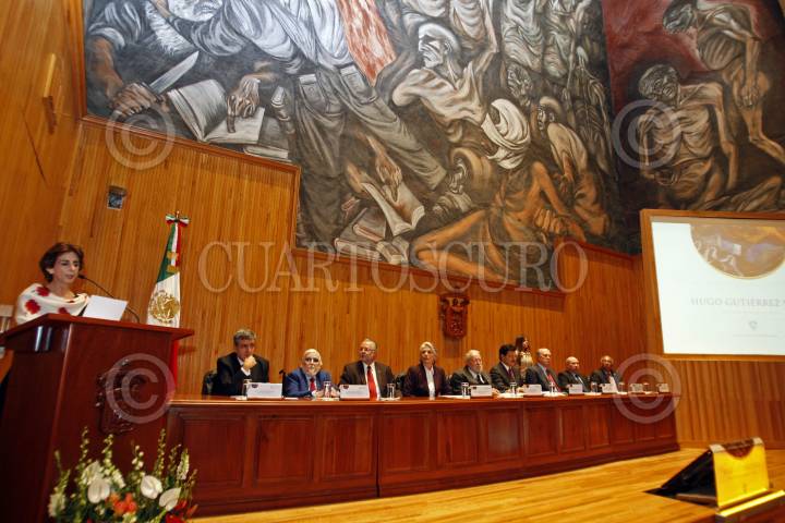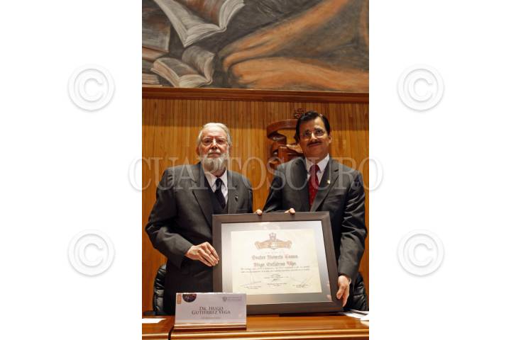 GUADALAJARA, JALISCO, 01DICIEMBRE2014.- Esta tarde en el Paraninfo de la Universidad de Guadalajara (U. de G.) y en el marco de la edición 28 de la Feria Internacional del Libro de Guadalajara 2014 (FIL), la Universidad de Guadalajara encabezada por el Rector Tonatiuh Bravo Padilla, reconoció con el Doctorado Honoris Causa al Poeta Hugo Gutiérrez Vega. FOTO: FERNANDO CARRANZA GARCIA / CUARTOSCURO.COM.