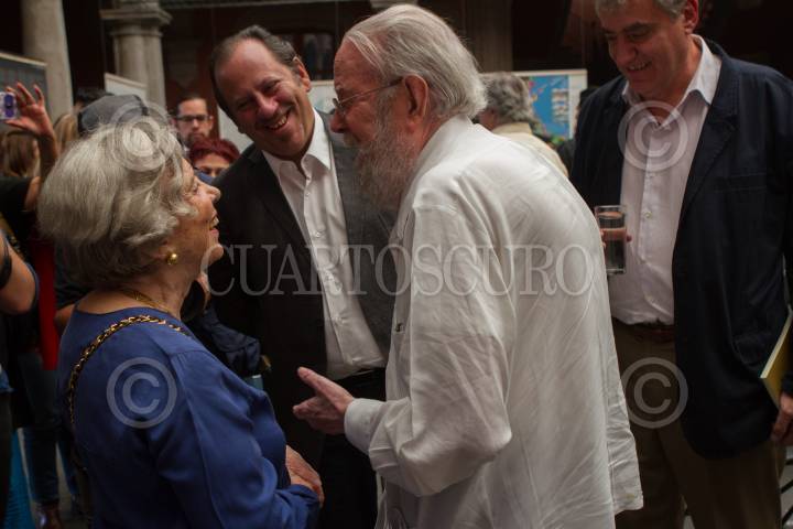 MÉXICO, D.F., 13JUNIO2015.- La escritora Elena Poniatowska conversa con Hugo Gutiérrez Vega, también se observa a Eduardo Vázquez, secretario de Cultura, al finalizar el homenaje que se le brindo al poeta Eduardo Lizalde en el Museo de la Ciudad de México. FOTO: MOISÉS PABLO /CUARTOSCURO.COM