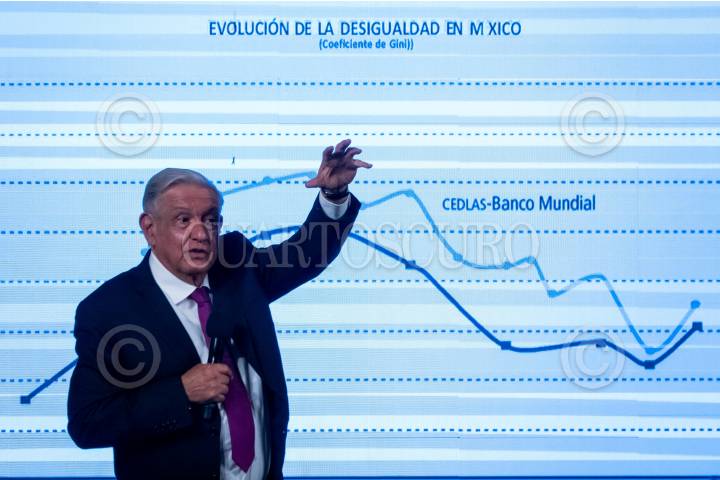 Andrés Manuel López Obrador muestra una gráfica de la desigualdad en el país, durante la conferencia matutina desde Palacio Nacional.