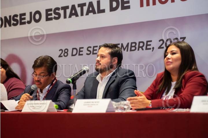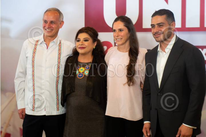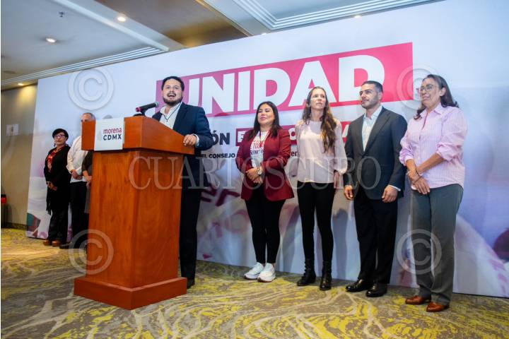 CIUDAD DE MÉXICO, 28SEPTIEMBRE2023.- Sebastián Ramírez, dirigente nacional de Morena, y Francisco Chíguil, consejero estatal de Morena, anunciaron que por unanimidad Morena eligió a Hugo López-Gatell, Clara Brugada, Omar Harfuch, y Mariana Boy, como sus precandidatos para encabezar la Coordinación de la Defensa de la Cuarta Transformación en la Ciudad de México, esto durante su consejo. FOTO: MORENA CDMX/CUARTOSCURO.COM