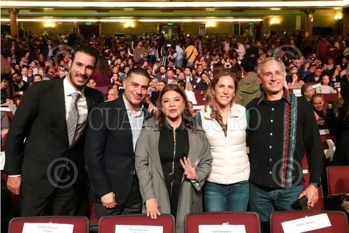 CIUDAD DE MÉXICO, 28NOVIEMBRE2023.- El diputado Miguel Torruco Garza; Omar Harfuch, exsecretario de Seguridad Ciudadana; Clara Brugada, coordinadora de los Comités de la Ciudad de México; Mariana Voy, excandidata a la jefatura de Gobierno y Hugo López-Gatell, ex subsecretario de Salud, durante el estreno del documental "Claudia. El Documental", realizado en el Teatro Metropolitan. FOTO: GRACIELA LÓPEZ /CUARTOSCURO.COM