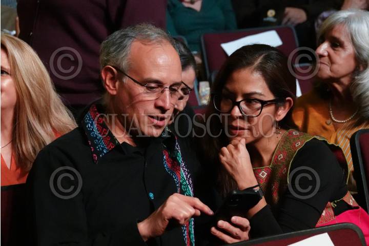 CIUDAD DE MÉXICO, 28NOVIEMBRE2023.- Hugo López-Gatell, ex subsecretario de Salud, y su esposa Rebeca Peralta, durante el estreno del documental "Claudia. El Documental", realizado en el Teatro Metropolitan. FOTO: GRACIELA LÓPEZ /CUARTOSCURO.COM
