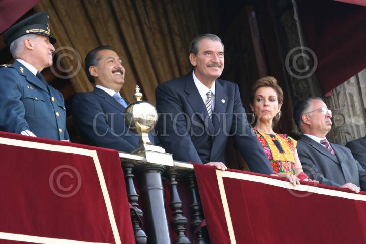 MEXICO, D.F. 20NOVIEMBRE2004.- Gerardo Clemente Vega, secretario de la Defensa Nacional, Manlio Fabio Beltrones, presidente de la mesa directiva de la cámara de diputados, el presidente Vicente Fox, su esposa Marta Sahagún y Mariano Azuela Huitrón, presidente de la Suprema Corte de Justicia de la Nación durante el desfile deportivo que conmemora el XCIV aniversario de la Revolución Mexicana. FOTO: Nelly Salas/CUARTOSCURO.COM