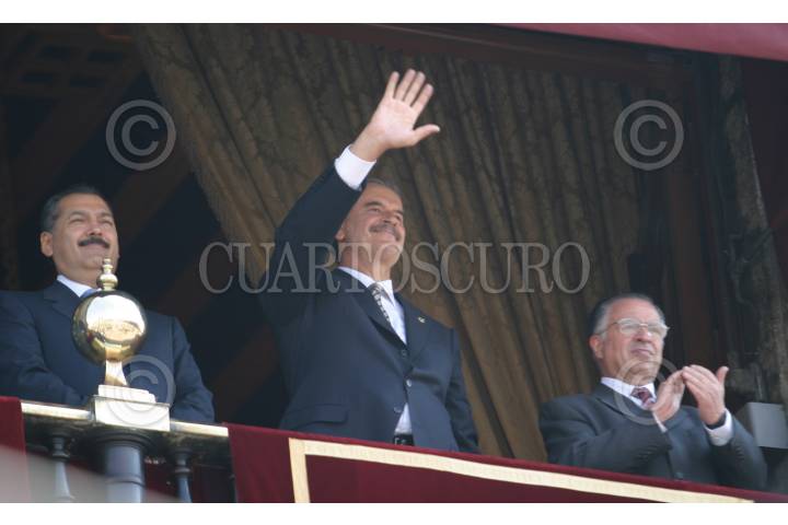 MEXICO, D.F. 20NOVIEMBRE2004.- Manlio Fabio Beltrones, presidente de la mesa directiva de la cámara de diputados, el presidente Vicente Fox y Mariano Azuela Huitrón, presidente de la Suprema Corte de Justicia de la Nación, durante el desfile conmemorativo del XCIV aniversario de la Revolución Mexicana. FOTO: Nelly Salas/CUARTOSCURO.COM