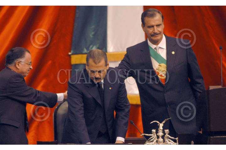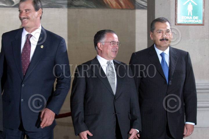 Mèxico, D.F., 03ENERO2005.- Mariano Azuela Huitrón, presidente de la Suprema Corte de Justicia de la Nación y Manlio Fabio Beltrones, presidente de la Cámara de Diputados se reunieron en la Suprema Corte. En la imagen, Vicente Fox, Mariano Azuela y Manlio Fabio, durante el informe de gobierno el 1 de Septiembre del 2004. FOTO: Moisés Pablo/CUARTOSCURO:COM