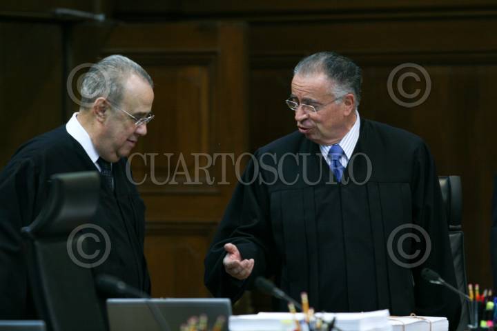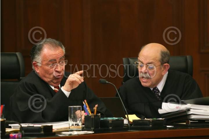 MÉXICO, D.F., 19JUNIO2007.- Los ministros Mariano Azuela Hüitrón y Jesús Gudiño Pelayo, durante la sesión en la Suprema Corte de Justicia, en donde se aprobó la creación de comisión invetigadora en los hechos de violencia que se sucitaron el año pasado en Oaxaca. FOTO: MOISÉS PABLO/CUARTOSCURO.COM