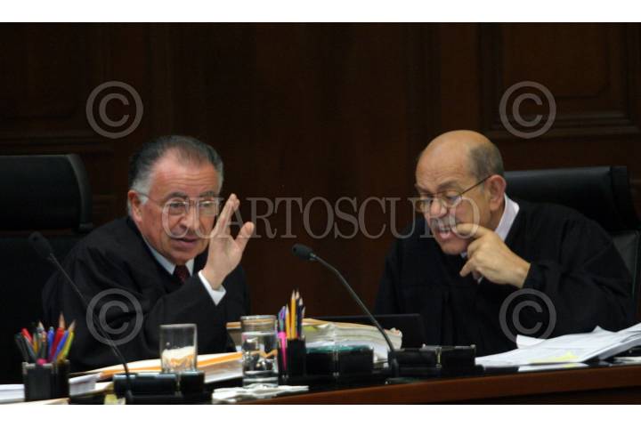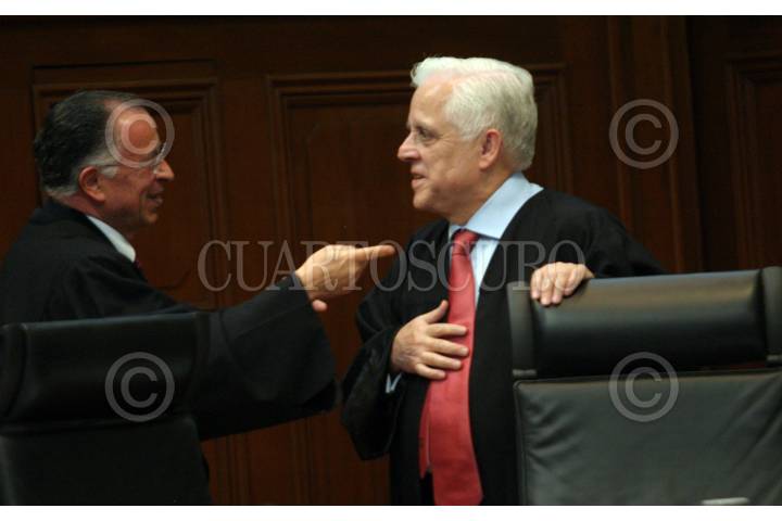 MÉXICO, D.F., 01JULIO2008.- Mariano Azuela Hüitrón y Jesús Gudiño Pelayo, ministros de la Suprema Corte de Justicia de la Nación, durante la sesión en la que se desahogo la controversia constitucional de la ley de la COFIPE, en su sede general ubicada en Pino Suárez en el Centro Histórico. FOTO: MOISÉS PABLO/CUARTOSCURO.COM