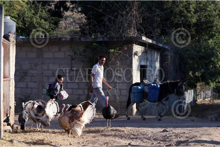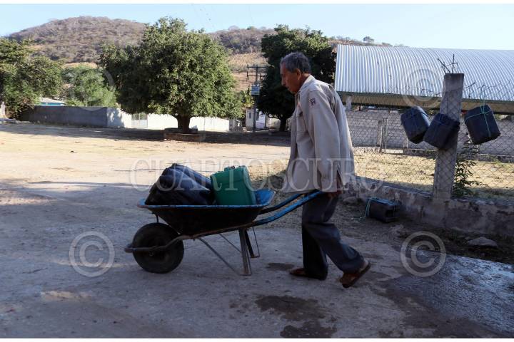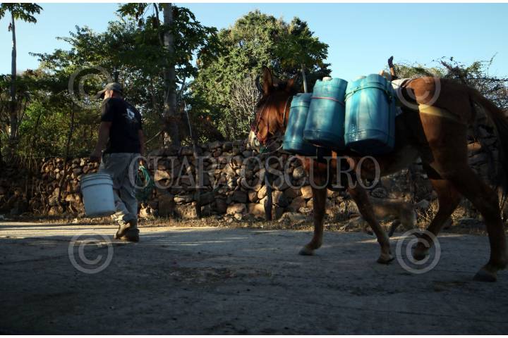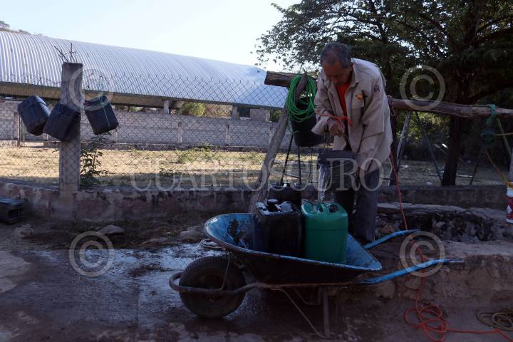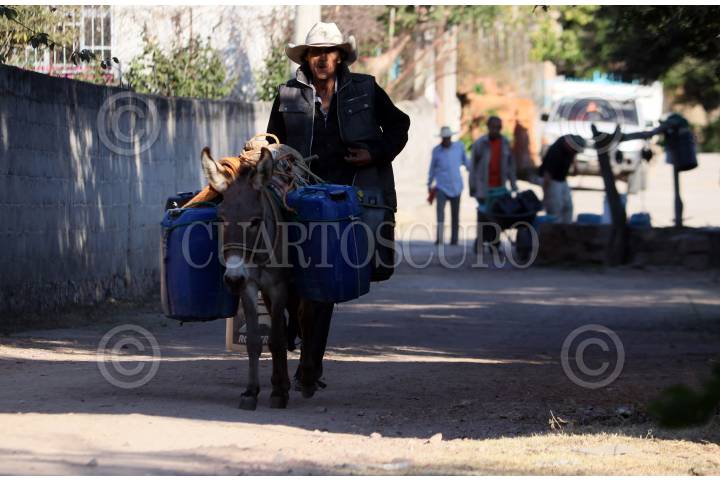 Hombres de Coahuilotla acarrean agua en garrafas para consumo humano de un pozo ubicado en el centro de la comunidad.