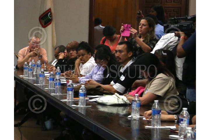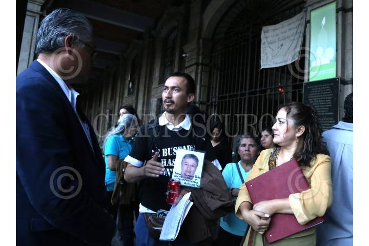 Mario Vergara Hernández, activista y fundador del colectivo Los Otros Buscadores, murió en un accidente en el lugar donde laboraba en Huitzuco, Guerrero. El incansable activista buscaba a su hermano Tomas Vergara desde el año 2012. Imagen de archivo del 20 de noviembre del 2015 donde Mario plática con Alejandro Vera, ex rector de la Universidad de Morelos y la activista Angelica Rodríguez en el portal del Palacio de Gobierno de Morelos; en su mano lleva una foto de su hermano.