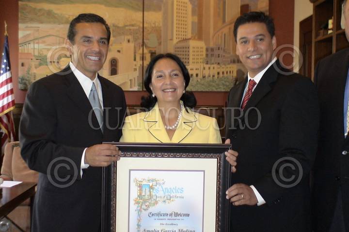 LOS ÁNGELES, CALIFORNIA E.U.A. 01JULIO2006.- La Gobernadora Amalia García recibió un reconocimiento, en la ciudad de Los Ángeles, California, por su lucha en pro de los derechos humanos y su liderazgo. El reconocimiento fue entregado por el alcalde de esta ciudad, Antonio Villarraigosa, y por el consejal de origen mexicano, José Huizar. FOTO: GOBIERNO DEL ESTADO DE ZACATECAS