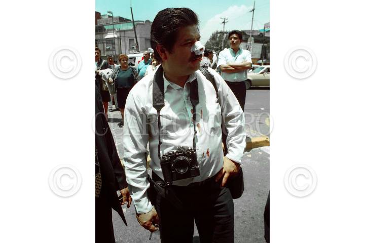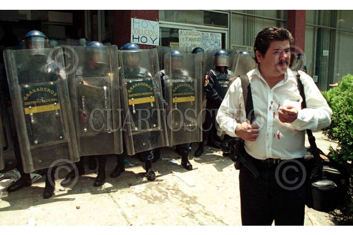 Rosalio Huizar, reportero grafico rsulto lesionado duranmte la trifulca entre granaderos y trabajadores de la secretaria de transporte y vialidad del D.F. FOTO: Pedro Mera/CUARTOSCURO.COM
