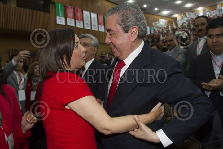 MÉXICO, D.F., 13JULIO2013.- Cristina Díaz, tomo protesta como presidenta de la Confederación Nacional de Organizaciones Populares (CNOP), en la imagen saluda al ex presidente del PRI Humberto Roque Villanueva. FOTO: ISAAC ESQUIVEL /CUARTOSCURO.COM