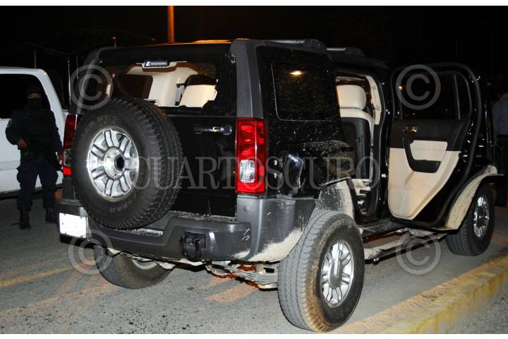CUNDUACÁN, TABASCO, 26ENERO2008.- Con impacatos de balas de alto calibre y con rastros de sangre sobre la cinta axfaltica fue encontrada una lujosa camioneta Hummer con placas de circulación WLZ-5456 de Tabasco sobre la rancheria Cumuapa. Segun los datos preeliminares del bando de datos de la Policía Estatal de Caminos pertenece a César Arnulfo Alvarez Leyva, y curiosos en el lugar afirman que el vehiculo fue interceptado por tres unidades motrices que abrieron fuego y sacaron al conductor por la fuerza, por lo que elementos policíacos investigan los hechos. FOTO: MARCO POLO GUZMÁN HERNÁNDEZ/CUARTOSCURO.COM