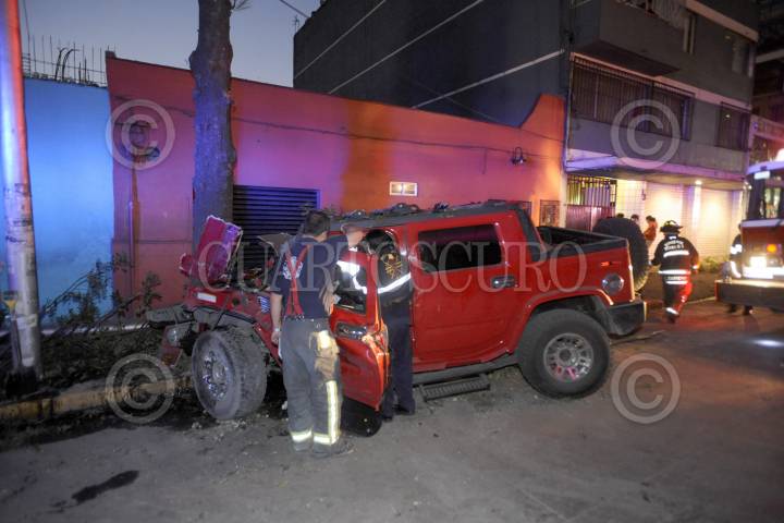 MÉXICO, D.F., 09MARZO2013.- Jorge Segura Reyna de 28 años quien conducía una camioneta Hummer se impacto contra un árbol después de derribar un poste, la marquesina de un restaurante y un poste de alumbrado público en Circuito Interior casi con San Cosme en la colonia Nueva Santa María, delegación Cuauhtemoc. Bomberos laboraron por varios minutos para liberar a este hombre que permaneció atrapado al interior de su camioneta para ser trasladado a la Cruz Roja en Polanco. FOTO: LUIS CARBAYO /CUARTOSCURO.COM