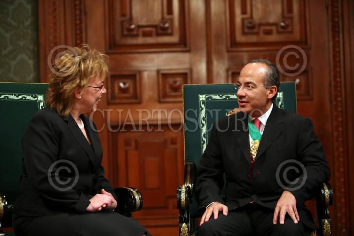 MÉXICO, D.F., 26FEBRERO2009.- El presidente de México, Felipe Calderón Hinojosa, durante la presentación de cartas credenciales a la señora, Terez Dorombozi de Dehelan, Embajadora extraordinaria y plenipotenciaria de la República de Hungria. Estó tuvo lugar en el salon embajadores del Palacio Nacional. FOTO: ARIEL GUTIERREZ/CUARTOSCURO.COM