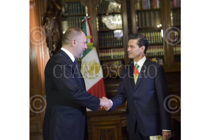 CIUDAD DE MÉXICO, 24OCTUBRE2016.- El Presidente Enrique Peña Nieto recibió hoy en el Palacio Nacional las cartas credenciales de 20 nuevos Embajadores en México. Al darles la bienvenida a nuestro país, el Presidente Peña Nieto les refrendó el interés de México por fortalecer la cooperación con sus naciones. En la imagen, el Primer Mandatario saluda a Ivan Medveczky, de Hungría. FOTO: PRESIDENCIA /CUARTOSCURO.COM