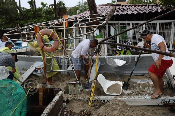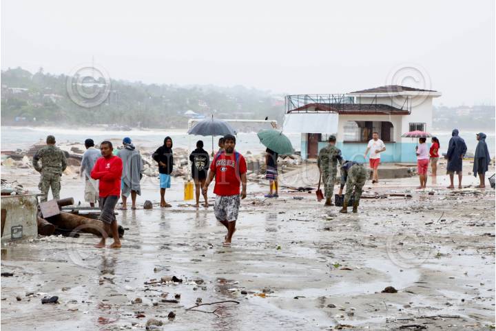 SAN PEDRO MIXTEPEC, OAXACA, 19JUNIO2025.- Lluvias constantes y oleaje elevado se registran en Puerto Escondido, luego de que el huracán Erick tocó tierra a las 5:30 de la mañana en Pinotepa Nacional, en la Costa de Oaxaca. Pescadores y prestadores de servicios turísticos realizan labores de limpieza y recuperación en la zona de playa, tras los daños ocasionados por los fuertes vientos y marejadas en la Playa Principal de Puerto Escondido. FOTO: CAROLINA JIMÉNEZ MARISCAL / CUARTOSCURO.COM