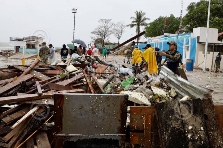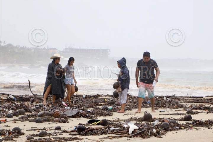 SAN PEDRO MIXTEPEC, OAXACA, 19JUNIO2025.- Pescadores y prestadores de servicios turísticos permanecen en la costa de Puerto Escondido, donde realizan labores de limpieza tras el paso del huracán Erick. El fenómeno tocó tierra esta mañana en Pinotepa Nacional y dejó afectaciones por oleaje elevado y vientos fuertes en la Playa Principal. FOTO: CAROLINA JIMÉNEZ MARISCAL / CUARTOSCURO.COM