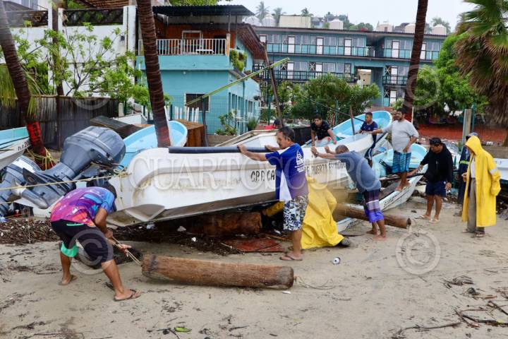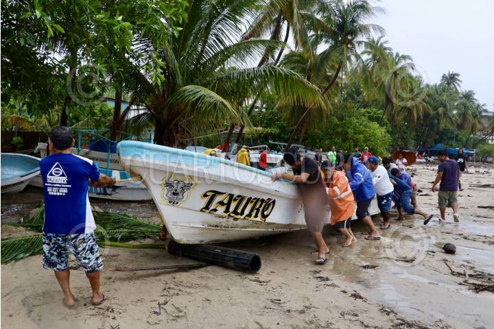 SAN PEDRO MIXTEPEC, OAXACA, 19JUNIO2025.- Pescadores y trabajadores turísticos mueven una lancha en la Playa Principal de Puerto Escondido, tras el paso del huracán Erick, que tocó tierra esta mañana en Pinotepa Nacional. El fuerte oleaje y los vientos dejaron afectaciones en la zona costera. FOTO: CAROLINA JIMÉNEZ MARISCAL / CUARTOSCURO.COM