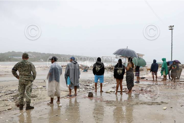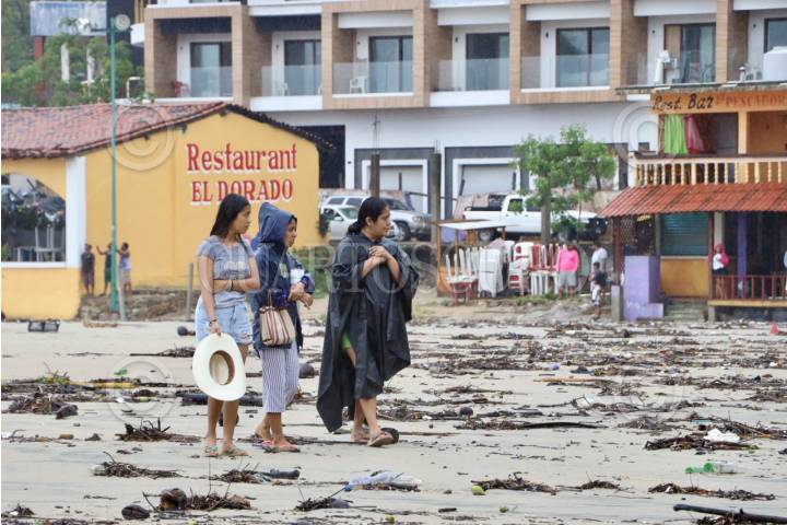SAN PEDRO MIXTEPEC, OAXACA, 19JUNIO2025.- Lluvias constantes y oleaje elevado se registran en Puerto Escondido, luego de que el huracán Erick tocó tierra a las 5:30 de la mañana en Pinotepa Nacional, en la Costa de Oaxaca. Pescadores y prestadores de servicios turísticos a pie de playa realizan labores de limpieza y rescate de sus propiedades, los fuertes vientos y marejadas dejaron algunos daños en la Playa Principal de Puerto Escondido. FOTO: CAROLINA JIMÉNEZ MARISCAL/CUARTOSCURO.COM