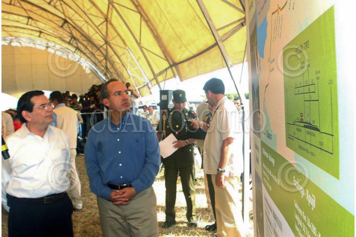 ESCARCEGA, CAMPECHE, 03FEBRERO2009.- Jorge Carlos Hurtado Valdez, Gobernador del estado junto a Felipe Calderón, Presidente de México y Luis Tellez, Secretario de Comunicaciones y Transporte durante la inauguración, ampliación y modernización de 92 kilómetros de la carretera Villahermosa-Escarcega-Xpujil. FOTO: ALFREDO GUERRERO/CUARTOSCURO.COM