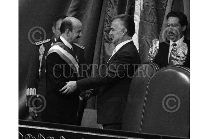 MÉXICO, D.F., 13MAYO2009.- En imágen de archivo, Carlos Salinas de Gortari, durante la toma de posesión como presidente de México, saluda a Miguel de la Madrid Hurtado (presidente saliente), el dia 1ro de Diciembre de 1988, en la Camara de Diputados. FOTO: ARCHIVO/TOMAS MARTÍNEZ/CUARTOSCURO.COM