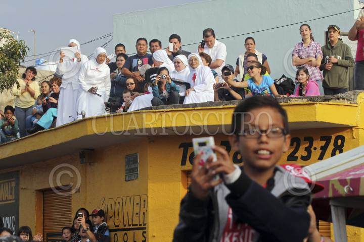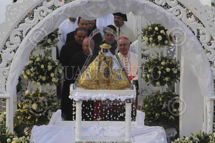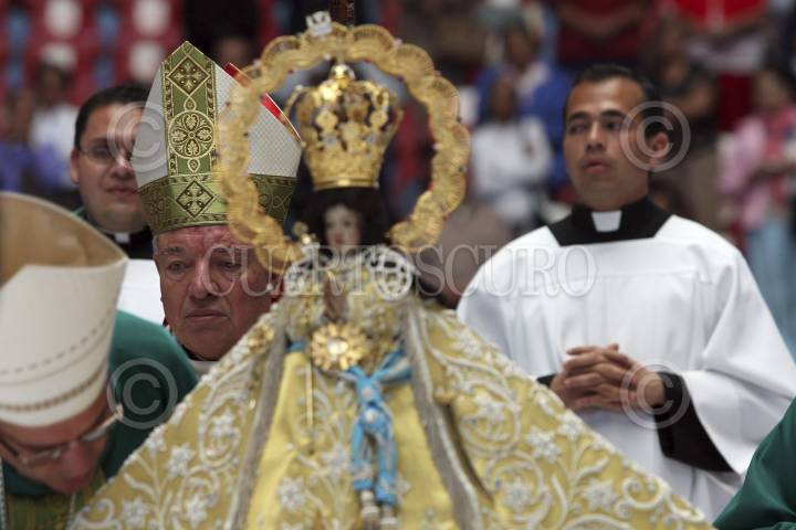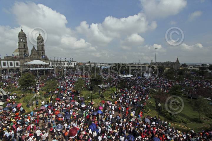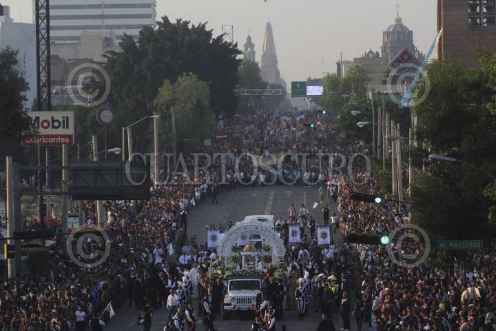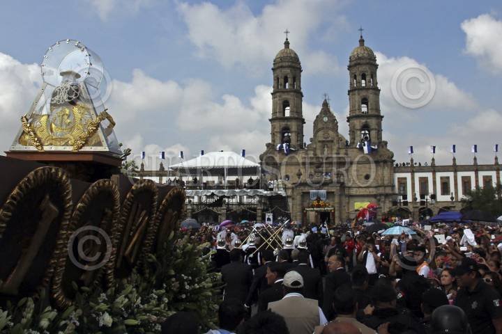 GUADALAJARA, JALISCO, 12OCTUBRE2013.- Hoy como cada año se llevo a cabo la Romería, a la cual acudieron aproximadamente 2 millones y medio de asistentes que acompañaron a La Generala hasta su santuario, la Basílica de Zapopan, el recorrido desde la Catedral metropolitana de Guadalajara hasta la Basílica, fue encabezado por el Arzobispo Emérito, Juan Sandoval Iñiguez y el Cardenal José Francisco Robles Ortega y en donde el nuncio Christophe Pierre, fue el encargado de oficiar la misa de bienvenida a la Virgen de Zapopan. FOTO: FERNANDO CARRANZA GARCIA /CUARTOSCURO.COM