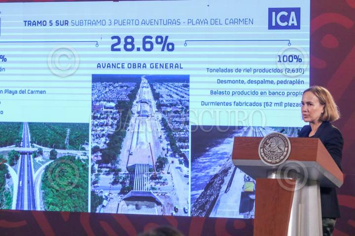 Guadalupe Phillips Margain, directora general de Empresas ICA, informa de los avances del Tramo 5 del Tren Maya, durante la mañanera.