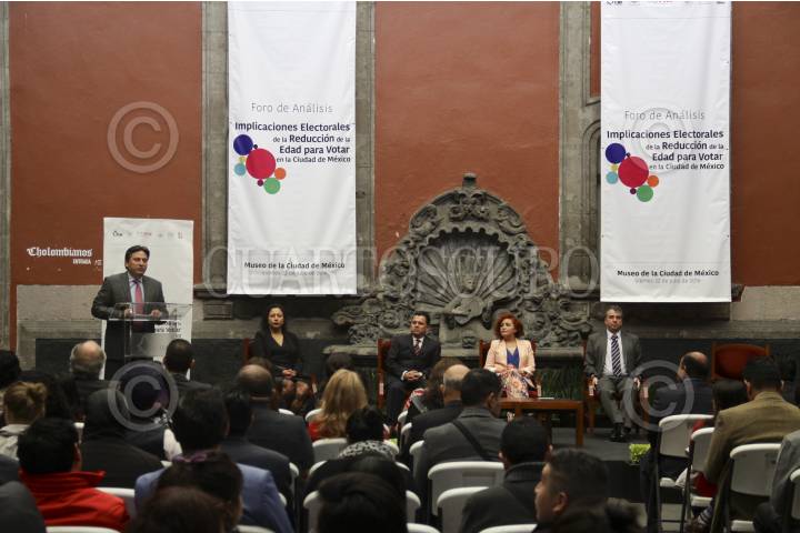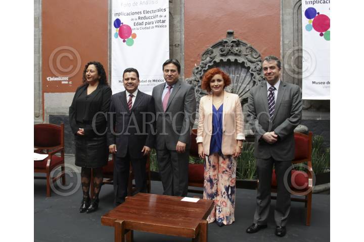 CIUDAD DE MÉXICO, 22JULIO2016.- Manuel Granados, consejero jurídico capitalino; Mario Velazquez Miranda, presidente consejero del Instituto Electoral del Distrito Federal; María Fernanda Olvera, directora del instituto de la Juventud y Yuri Beltrán, consejero del IEDF, durante la inauguración del foro de análisis “Implicaciones Electorales de la Reducción de la Edad para Votar en la Ciudad de México” en el Museo de la Ciudad de México. FOTO: ANTONIO CRUZ /CUARTOSCURO.COM