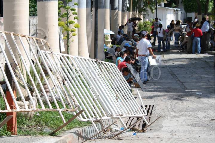 CHILPANCINGO, GUERRERO, 05OCTUBRE2008.- Maestros pertenecientes a la Coordinadora Estatal de los Trabajadores de la Educación en Guerrero (CETEG), egresados de la normal rural de Ayotzinapa y de la normal rural de la montaña, durante la protesta que realizaron afuera de las instalaciones del Instituto Electoral del Estado de Guerrero (IEEG), en la cuál quitaron las vallas de seguridad que resguardaban el organo electoral, realizaron pintas y quemaron una manta ademas de propaganda electoral, esto en protesta contra la Alianza por la Calidad de la Educacion (ACE) en la que hicieron un llamado a la ciudadania a no votar, en el proceso electoral que se desarrolla en el estado, donde se elegiran alcaldes y diputados locales. FOTO: OSCAR ALVARADO/CUARTOSCURO.COM