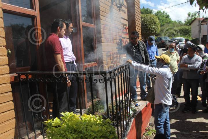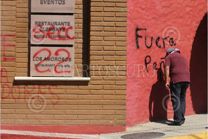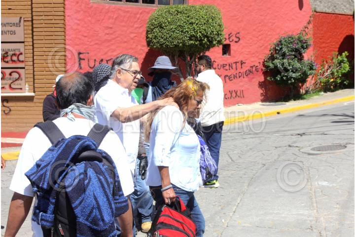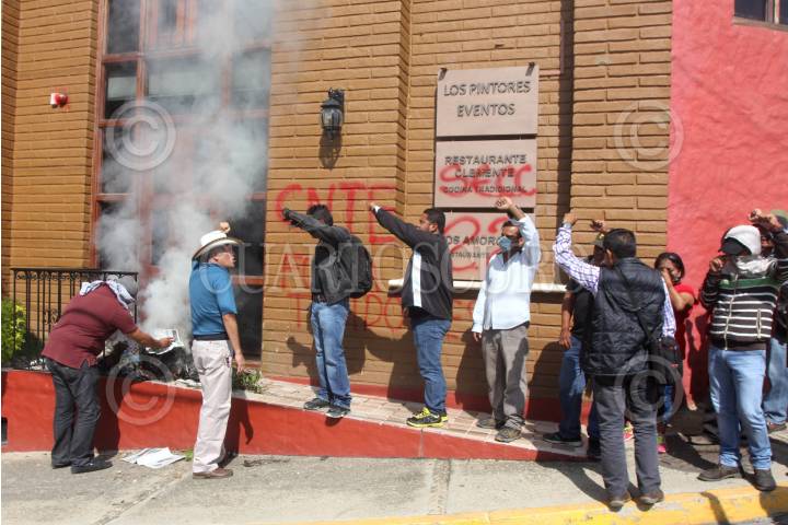 OAXACA, OAXACA., 12JULIO2016.- Profesores de la sección 22 de la CNTE protestaron en el exterior de un hotel ubicado al norte de la capital del estado donde se realizaría una reunión de supervisores escolares, sin embargo ante la llegada de los mentores esta fue suspendida, sin embargo al interior del hotel ya había un grupo de supervisores. Mentores de la gremial encapuchados entraron al inmueble y sacaron a los supervisores, sin embargo llamaron a los manifestantes a no agredirlos pues la actividad se trataba de boicotear el evento así como a identificarlos, no obstante a 3 supervisores les reventaron huevos en el cuerpo. FOTO: ARTURO PÉREZ ALFONSO /CUARTOSCURO.COM