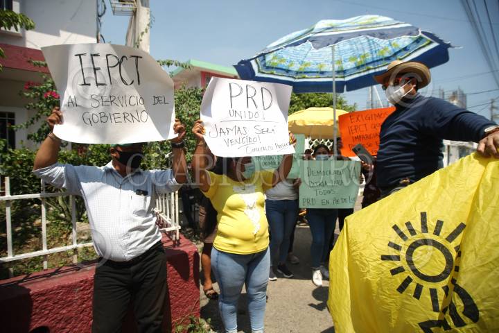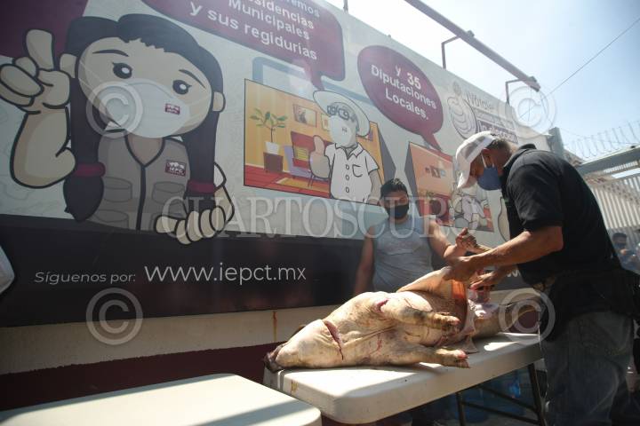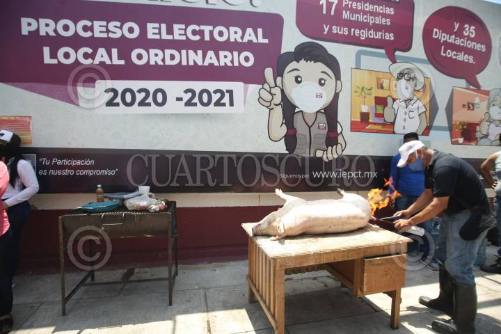 Perredistas mataron tres cerdos afuera del Instituto Electoral y de Participación Ciudadana de Tabasco (IEPCT) para exigir la destitución de los consejeros electorales.