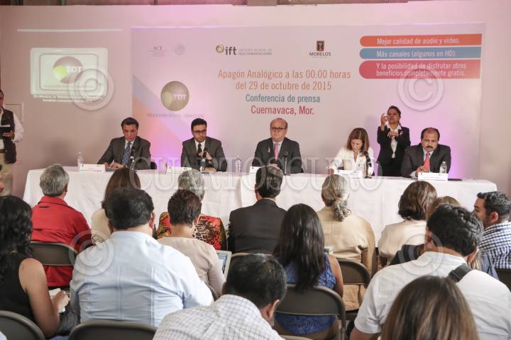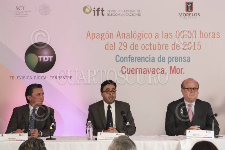 CUERNAVACA, MORELOS, 12OCTUBRE2015.- Gabriel Contreras Saldívar, presidente del Instituto Federal de Telecomunicaciones (UFT), Graco Ramírez, gobernador del estado, Mónica Aspe Bernal, subsecretaria de Comunicaciones y Transporte (SCT), y Javier Lizárraga, coordinador de la Sociedad de la Información y el Conocimiento de la SCT ofrecieron una rueda de prensa para dar a conocer los detalles del apagón analógico que se llevará a cabo el próximo 29 de octubre del año en curso. FOTO: PATRICIA MORALES /CUARTOSCURO.COM