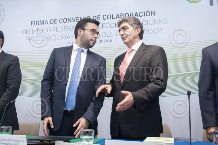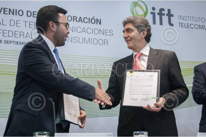 CIUDAD DE MÉXICO, 20SEPTIEMBRE2016.- Gabriel Contreras Salvídar, comisionado presidente del Instituto Federal de Telecomunicaciones (IFT), y Ernesto Nemer Álvarez, titular de la Procuraduría Federal del Consumidor (Profeco), encabezaron una firma de convenio de colaboración entre ambas dependencias de gobierno. FOTO: DIEGO SIMÓN SÁNCHEZ /CUARTOSCURO.COM