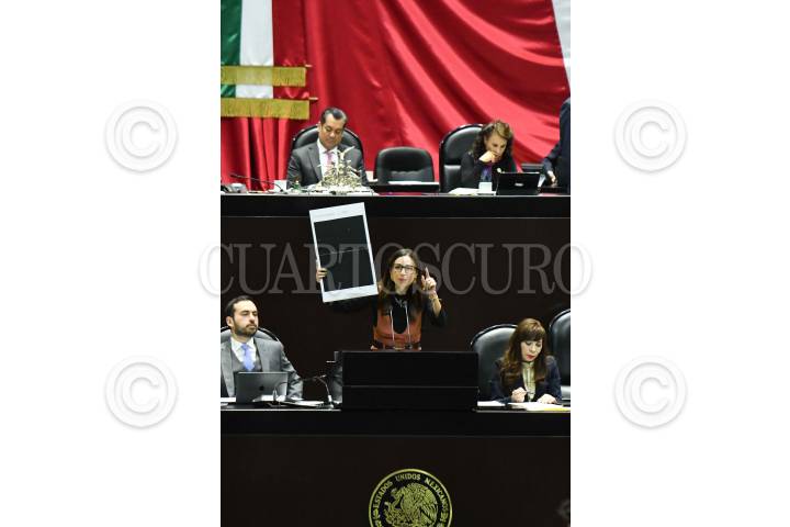 CIUDAD DE MÉXICO, 21NOVIEMBRE2024.- Paulina Rubio Fernández, diputada del PAN, junto a sus compañeros de bancada, mostraron una réplica de cartón de la denominada "casa gris" durante la continuación de la sesión ordinaria de la Cámara de Diputados en la que se discuten las reservas del dictamen en materia de simplificación orgánica. FOTO: MARIO JASSO/CUARTOSCURO.COM