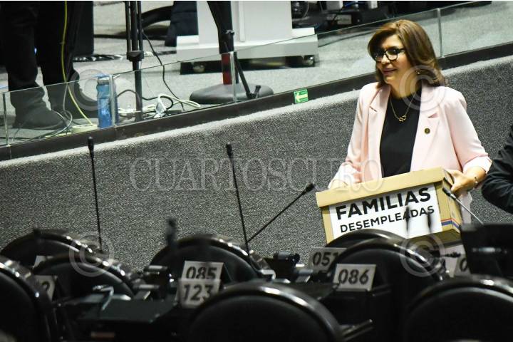CIUDAD DE MÉXICO, 21NOVIEMBRE2024.- Eva Vásquez, diputada del PAN, carga una caja con la frase "familias desempleadas", durante la continuación de la sesión ordinaria de la Cámara de Diputados en la que se discuten las reservas del dictamen en materia de simplificación orgánica. FOTO: MARIO JASSO/CUARTOSCURO.COM