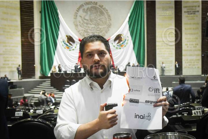 CIUDAD DE MÉXICO, 21NOVIEMBRE2024.- Carlos Eduardo Gutiérrez, diputado del PRI, quemó una hoja con las siglas de los organismos que están por desaparecer contemplada en el dictamen en materia de simplificación orgánica. FOTO: MARIO JASSO/CUARTOSCURO.COM