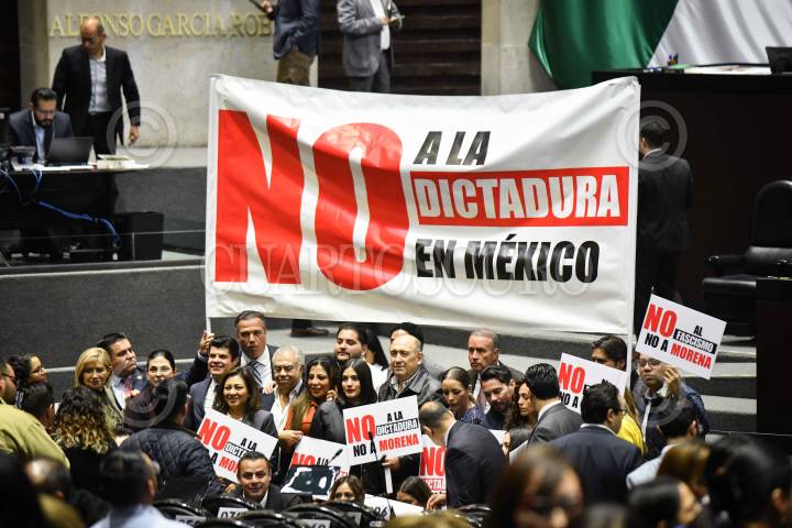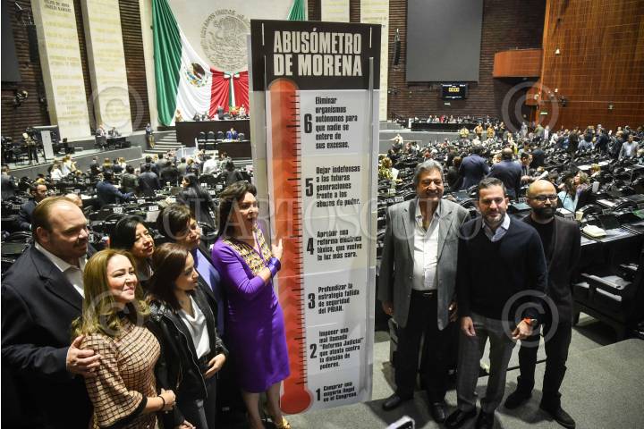 CIUDAD DE MÉXICO, 21NOVIEMBRE2024.- Ivonne Ortega, diputada de MC, junto a sus compañeros de bancada, colocaron un "abusómetro de Morena" durante la continuación de la sesión ordinaria de la Cámara de Diputados en la que se discuten las reservas del dictamen en materia de simplificación orgánica. FOTO: MARIO JASSO/CUARTOSCURO.COM
