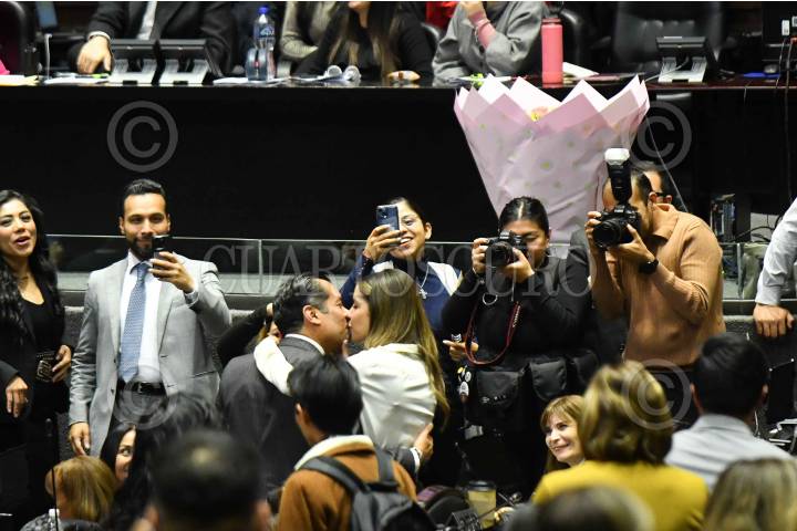 CIUDAD DE MÉXICO, 21NOVIEMBRE2024.- Sergio Gutiérrez, presidente de la mesa directiva, besa a su esposa Diana Karina Barreras, diputada del PT, durante la continuación de la sesión ordinaria de la Cámara de Diputados en la que se discuten las reservas del dictamen en materia de simplificación orgánica. FOTO: MARIO JASSO/CUARTOSCURO.COM